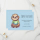 Save the date card with an adorable illustration featuring a happy looking sloth wearing a green t-shirt.