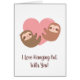 A greeting card with a cute illustration of a pair of sloths hugging on to a pink heart with the caption "I Love Hanging Out With You!" A sweet Valentines day or love confession design.