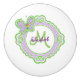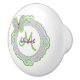Cute smiling butterfly fluttering on the edge of decorative frame for monogram adds a special touch to round ceramic knob featuring spring green and floral lavender colours. A fun and special drawer pull for a little girl’s room. Adding her personal monogram make it extra special. Change the name and initial on the monogram using the template provided.