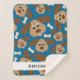 This blue baby blanket features a collage of a smiling dog with big ears and dog bones on a dark blue background. Personalize this adorable blanket with your child's name.