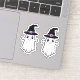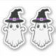 Destei's cartoon illustration of a cute smiling ghost character. The ghost is wearing a witch's hat with purple details. The ghost is placed two times on the design area. Ideal for Halloween time.