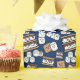 A fun S'mores themed gift wrap on a blue background. Filled with marshmallows and crackers. A fun camping themed pattern.