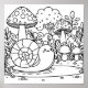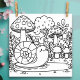 A snail crawling by cute mushrooms in a cottage core style colouring poster. Cute adult colouring poster for kids, teens or adults, Simple thick lines to make colouring easier.