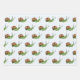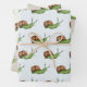 Cute wrapping paper with an pattern of a green snail in different colour backgrounds: blue, tan and yellow. Illustration and design by Patricia Alvarez.