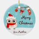 The owl in the front has rose and beige pattern with a red scarf and santa hat in the snowflakes and light blue background. The back of the ornament has the same owl with 2 red balls, candy cane, and a red sock on the branch. One red gift box and a white one with polka dots pattern on the ground. Candy canes and stars on the right corner and the texts are all customisable. This is a digital illustration and customisable.