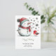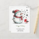 Cute snowman wearing a Santa hat and a red bird on a postcard. Text can be changed. AI assisted graphic purchased with commercial use. Artwork: RedHeronLighthouse
