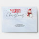 Cute snowman and snow Christmas holiday envelope. It features the typography "Merry Christmas", an endearing snowman dressed in a bright red scarf and hat and snowflakes on the flap, positioned on a gentle blue background.