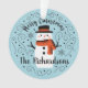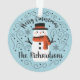 A cute Christmas snowman with the words Merry Christmas decorates this ornament. Personalise it with your family name. A fun accent for the Christmas holiday season. Designed for you by Blackberry Boulevard.