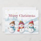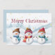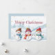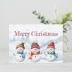 Send warm winter cheer with this flat Christmas card featuring three adorable snowmen in colourful scarves and hats against a snowy winter landscape. The front reads Merry Christmas in festive red lettering, while the back includes your personalised holiday message: