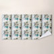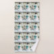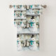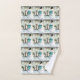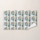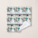 Patterned bath towels with a cute drawing featuring a snowman wearing a cool top hat and scarf. The background has a line of whimsical snow-covered pine trees.