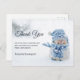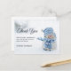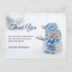 Thank you postcard with a cute photograph with a little snowman. Standing outside in the winter with snow falling all around. This cute little guy is dressed up in blue knitted outdoor clothing. Some white/grey bokeh flare in the background.