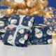 Two cute snowman are featured on this whimsical Christmas wrapping paper. One adorable snowman has on his Santa hat while the other is snug in his woodsman hat. White snowflakes and snow complete the holiday pattern.