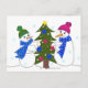 A fun snow scene featuring two little snowmen putting ornaments on a Christmas tree.