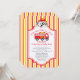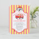 Cute sound the alarm firetruck baby shower invitation featuring an adorable black & white Dalmatian puppy dog wearing a fireman hat & a red firetruck set on a modern red, yellow & white stripe background. Flip our fireman invitation over for a matching stripe back for an extra special touch. Perfect for a girls baby shower, boys baby shower or gender neutral baby shower.