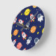 Blast off into a world of wonder with this adorable space-themed pattern perfect for little dreamers. Cheerful smiling planets in bright yellow, orange, pink, and peach float alongside red rockets zooming through the stars, cute floating astronauts, twinkling yellow stars, and constellation lines on a deep navy blue background. The playful, cartoon style and vibrant colours create a joyful, imaginative mood that's out of this world.