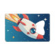 Cute red and white rocket blasting off in space with whimsical stars and clouds.