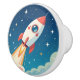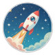 Cute red and white rocket blasting off in space with whimsical stars and clouds.