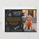Celebrate Halloween with this charming photo greeting card, featuring a whimsical design on both front and back. The front showcases a central photo area framed by playful white doodles of ghosts, pumpkins, and bats, all set against a black background. An orange banner at the bottom highlights your personalised message. The back continues the festive theme with a cute photo template, accompanied by a heartfelt Halloween greeting. Perfect for sharing spooky fun with friends and family, this card combines cuteness and customisation in one delightful package.