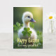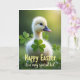 This card features a close-up portrait of a fluffy, pale yellow baby bird, its soft down catching warm light like a gentle halo. The little bird’s dark eyes glance slightly to the right, giving it a shy, friendly look, and its small bill shows a faint pink tint. Behind it, the background fades into a blurred green meadow effect, like sunlit grass out of focus, keeping all attention on the chick 🐰. Bright green three-leaf clovers sit around the bird, including one placed prominently in the foreground as if it’s being offered like a tiny gift between friends 🌷. The lighting stays soft and golden, adding a cozy, springtime glow to the feathers and the surrounding greens. A short seasonal greeting is printed along the bottom edge in a light, gentle color, centered and easy to read without crowding the image. The clover in front shows crisp leaf edges with a slightly glossy sheen against the soft, fuzzy texture of the chick.