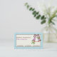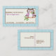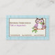 Cute spring owl on a branch with turquoise blue plaid border business cards, featuring a cute spring owl in purple and dark brown holding a flower in her beak (bill) on a branch with green leaves on turquoise blue plaid border. An adorable, feminine, decorative design for owl lovers. Artwork by Trina Clark.