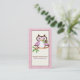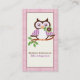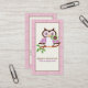 Cute spring owl on a branch with pink plaid border business cards, featuring a cute spring owl in purple and dark brown holding a flower in her beak (bill) on a branch with green leaves on pink plaid border. An adorable, feminine, decorative design for owl lovers. Artwork by Trina Clark.