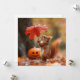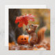 This adorable image features a red squirrel standing upright in the rain, holding a large autumn leaf like an umbrella above its head. A carved pumpkin sits nearby, adding to the festive autumnal ambiance. The photo captures a charming and unexpected moment in nature.