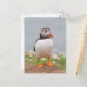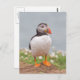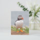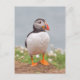 A front view of a cute puffin standing on the cliff edge with flowers behind. From Skomer Island.