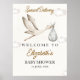 Celebrate your baby's arrival with our charming, gender-neutral baby shower design, featuring a classic white stork flying over a soft, light brown sky, carrying a sweet baby. Perfect for a boy, girl, or surprise shower, this elegant and minimalist design adds a warm and timeless touch to your event. For complementary elements, see our collection of this lovely design.