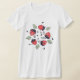 Cute strawberry shirt with a vector illustration depicting five happy smiling strawberry characters dancing in a circle surrounded by leaves and flowers of their own kind. Fun design with a spring spirit for a person who loves these yummy fruits and kawaii style.