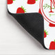 NewParkLane - Mouse Pad, with a pattern of little red strawberries. A fun design with a round frame for your name and monogram. Easy to customize in Zazzle with your own text for a personalized design. All text styles, colors, sizes can be modified to fit your needs.