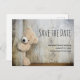 Save the date birthday, baby shower or other event postcard. Designed with a darling photograph of a cute stuffed bear, standing by a rustic wooden wall / backdrop.
