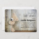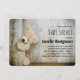A baby shower invitation with a darling photograph of a cute stuffed bear, standing by a rustic wooden wall / backdrop.