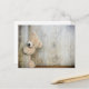 A postcard with a darling photograph of a cute stuffed bear, standing by a rustic wooden wall / backdrop.