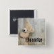 Personalised button with a darling photograph of a cute stuffed bear, standing by a rustic wooden wall / backdrop.