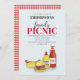 This fun and whimsical design features a modern minimalist picnic family reunion, fun summer cookout trendy colourful, barbeque barbecue BBQ cute retro, hamburger cheeseburger hotdog vintage, hotdog mustard ketchup cartoon, trendy script calligraphy food gingham, sausage outdoor picnic chef grill, simple minimalist illustration, gingham red tablecloth, potluck outdoor backyard
