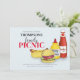 This fun and whimsical design features a modern minimalist picnic family reuna ion, fun summer cookout trendy colourful, barbeque barbecue BBQ cute retro, hamburger cheeseburger hotdog vintage, hotdog mustard ketchup cartoon, trendy script calligraphy food gingham, sausage outdoor picnic chef grill, simple minimalist illustration, gingham red tablecloth, potluck outdoor backyard