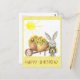 Wish your family and friends a happy birthday with this cute postcard featuring a yellow sunflower, wheelbarrow, and bunny rabbit illustration!