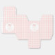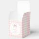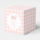 Elegant sweet preppy baby girl shower favour thank you candy box showcasing cute pastel pink bow with baby pink gingham pattern.