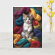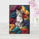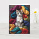 Beautiful grey and white tabby cat with blue eyes made himself comfortable amongst colourful threads of yarn on this blank greeting card.