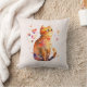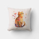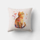 Pillow with an adorable watercolor illustration. An orange tabby cat looking friendly and happy with hearts swirling around.