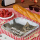Paper plates with a funny photograph of a tabby cat. Hair on his back slightly raised and he has a surprised expression on his face. Cute and adorable. Makes you smile. :)
