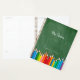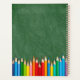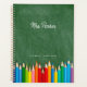 A modern personalised planner for teachers featuring a green chalkboard background with colourful coloured pencils. Teacher's Name in Script. Custom text at bottom in a serif font.