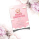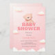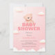 Celebrate the upcoming arrival with this adorable teddy bear baby shower invitation! Featuring a smiling baby bear holding a heart, surrounded by soft clouds in a pastel pink sky, this sweet design is perfect for a baby girl’s special day.