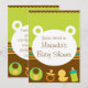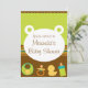A cute and stylish invitation for your baby shower. All text is fully customisable for your own special occasion, written on a white silhouette of a teddy bears head on a background of polka dots and strips in modern colours. A pacifier, bib, bottle and rubber ducky are pictured on the bottom of the invitations.