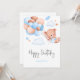 Celebrate a special birthday with this adorable and whimsical card featuring a cute teddy bear floating among fluffy clouds and holding a bouquet of pastel balloons in blue, peach, and beige tones. The cheerful design is accompanied by playful details like stars and a charming little bird. Perfect for children or anyone who loves sweet and charming designs, this card is personalised with the recipient's name for a thoughtful and unique touch.