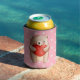 Can cooler with a cute watercolor illustration. A brown teddy bear carrying a big red heart. Light yellow polka dots on a pink background.