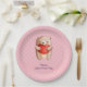 Paper plates with a cute watercolor illustration. A brown teddy bear carrying a big red heart. Light yellow polka dots on a pink background.