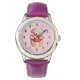 A watch with a cute watercolor illustration. A brown teddy bear carrying a big red heart. Little polka dots on a pink background.