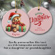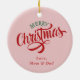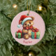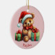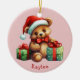 Here's a cute Christmas ornament, especially for a little daughter, granddaughter, or niece. The front has an image of an adorable teddy bear wearing a red and white Santa hat. Beside him are green gift packages tied with bright red bows. Her name is at the bottom, and everything is placed on a pale pink grey background. The back has stylised text that says "Merry Christmas" in red and green, and your own custom signature.