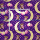 Cute and colourful baby pattern with an adorable teddy bear cartoon with a pink bow ribbon sitting on a sleeping moon holding balloons in light yellow and pink and colourful stars, colourful balloons, stars, teddies with a royal purple background.
